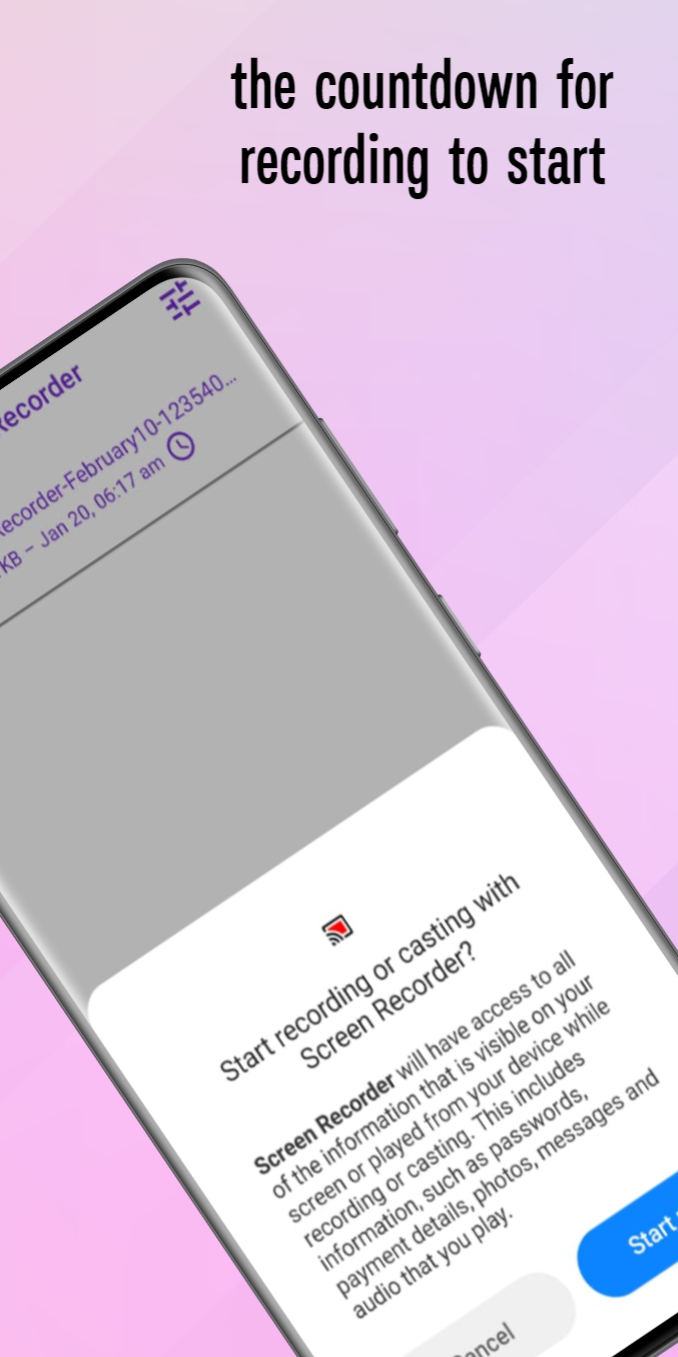 My screen recorder is very easy to use app just click on recording floating button and screen recording will start instantly.